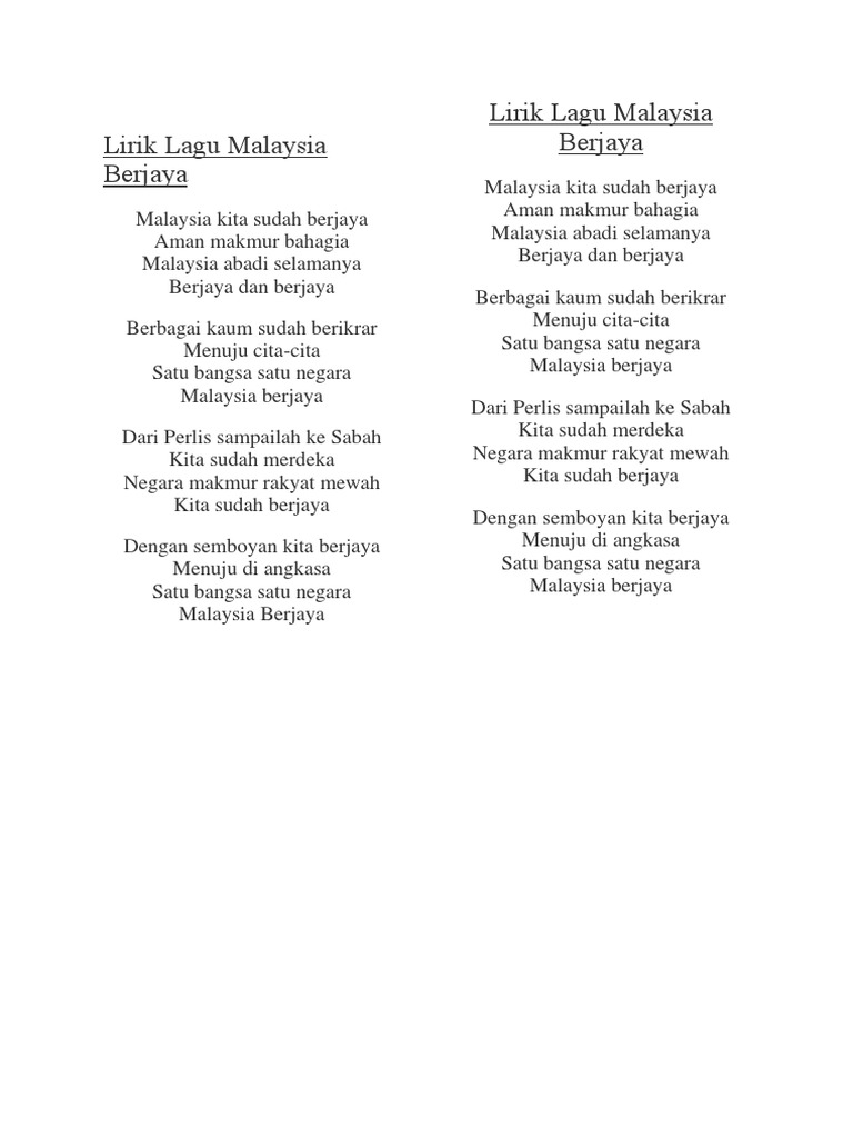 Lirik Lagu Sejahtera Malaysia Worksheet
